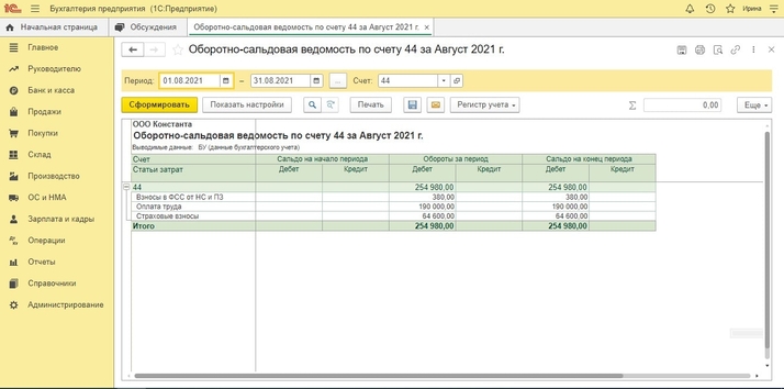 Посмотрим Оборотно-сальдовую ведомость по счету 44 за август. Для этого необходимо перейти в раздел «Отчеты» и нажать на ссылку «Оборотно-сальдовая ведомость по счету». Далее нужно выбрать период (месяц, год), нужный номер счета и нажать кнопку «Сформировать».