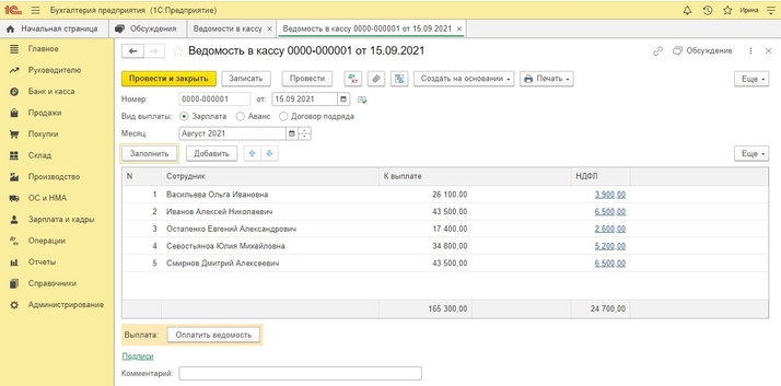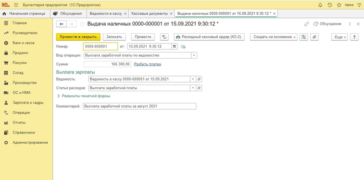 Через раздел «Зарплата и кадры» необходимо создать документ «Ведомость в кассу». Верхняя часть заполняется аналогично документу начисления. Табличная часть заполняется автоматически после нажатия кнопки «Заполнить».