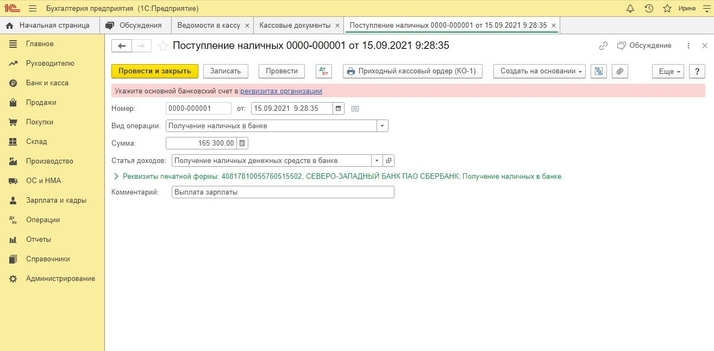 Перед тем, как выплачивать ЗП через кассу, необходимо оприходовать деньги с расчетного счета в банке. Для этого в программе 1С: Бухгалтерия создается «Приходный кассовый ордер (ПКО)». Он находится в разделе «Банк и касса» в группе команд «Касса». Нажимаем «Создать». При заполнении документа, указываем название статьи движения денежных средств (ДДС): Получение наличных д/с в банке. В строке «Основание» прописываем: «Выплата зарплаты».