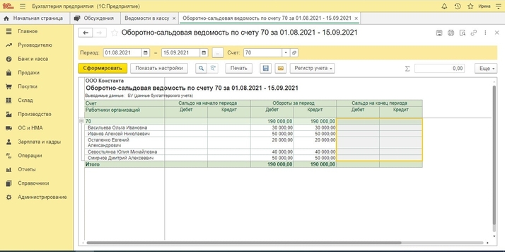Заполненные документы проведем и посмотрим бухгалтерские проводки. Сформируем ОСВ по счету 70.