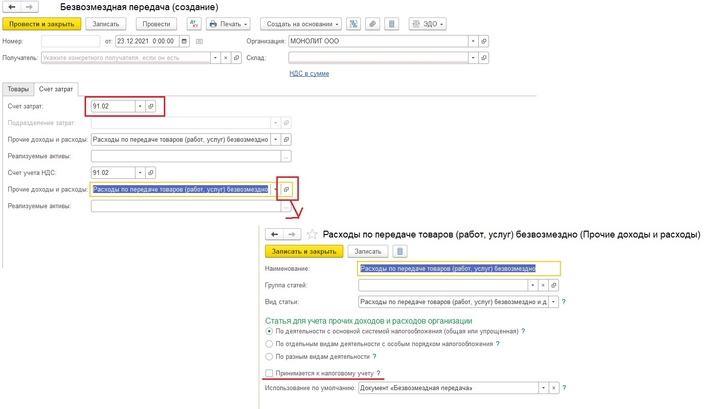 Теперь давайте рассмотрим оформление данной ситуации в программе 1С:Бухгалтерия предприятия 3.0. В программе для отражения приобретения подарков создаётся документ «Поступления» (раздел «Покупки» ‒ «Поступление (акт, накладная)». В поле «Контрагент» выбираете поставщика, у которого приобретаете подарки. На вкладке «Товары» отражаете сам подарок. В целом оформление поступления подарка ничем не отличается от обычного поступления. После оформления документа выписываете счёт-фактуру. Выдачу подарков вы оформляете документом «Безвозмездная передача». Создать его вы можете на основании документа «Поступления» либо в разделе «Продажи» ‒ «Безвозмездная передача». Хоть передача и является безвозмездной, но суммы в документе будут указаны. На вкладке «Счёт затрат» выбираете счёт 91.02 и статью прочих доходов расходов «Расходы по передаче товаров безвозмездно и для собственных нужд». Обратите внимание, чтобы внутри статьи была снята галочка «Принимается к налоговому учету».