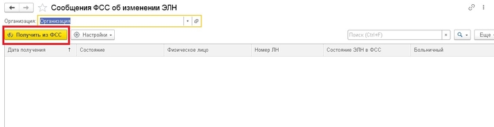 Как уже мы разобрали ранее, сотрудник не оповещает работодателя об открытии больничного листа, это делает ФСС. Давайте рассмотрим, как же в программу приходят уведомления об открытии больничного листа. Данные о состоянии листка нетрудоспособности поступают в рабочее место «Сообщения ФСС об изменении ЭЛН» (в программе 1С:ЗУП это раздел «Кадры» — подраздел «Пособия» — «Сообщения ФСС об изменении ЭЛН»). Загрузка сообщений от ФСС производится по кнопке «Получить из ФСС».
