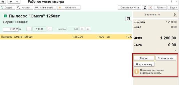 Также в программе можно отложить чек на время исправления ошибки оплаты, к примеру чтобы можно было принять следующего покупателя. Сделать это можно по кнопке «Отложить чек» (рис. 2).