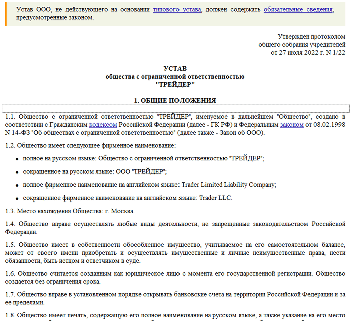 Если вы приняли решение самостоятельно разработать устав, сможете, как в конструкторе, сложить необходимые переменные, чтобы получить именно то, что вам нужно. Разработать устав ООО поможет СПС КонсультантПлюс. В нем есть как полезные Готовые решения: как составить устав ООО с несколькими участниками, как составить устав ООО с единственным участником, так и различные образцы заполнения и формы с комментариями о рисках. Ниже – пример устава из КонсультантПлюс.