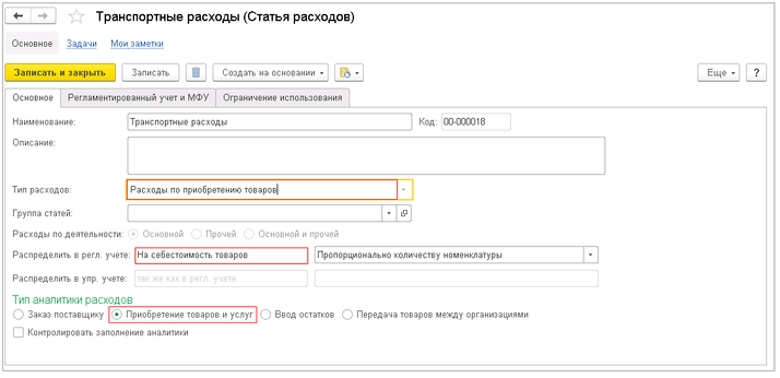 Следует зайти в раздел «Финансовый результат и контроллинг» «Статьи расходов». Создать статью расходов с типом "Расходы по приобретению товаров" и способом распределения "На себестоимость товаров". Обязательно укажите тип аналитики – "Приобретение товаров и услуг".
