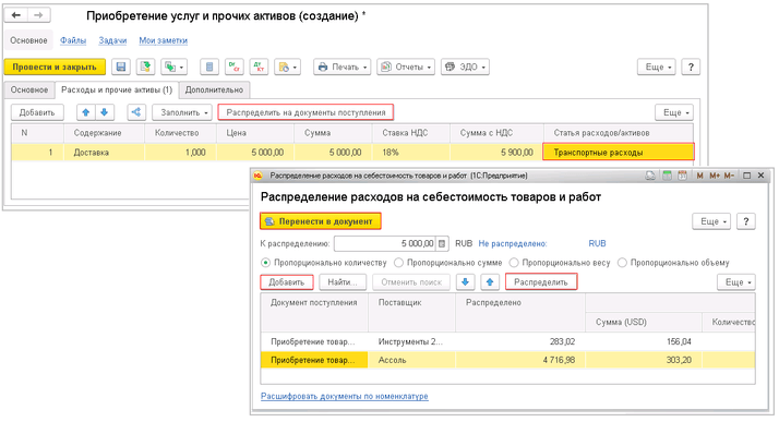 В разделе «Закупки» «Документы закупки (все)» создаем документ «Приобретение услуг и прочих активов». Заполните необходимые данные в документе и укажите статью расходов с ранее созданными настройками. Нажмите кнопку "Распределить на документы поступления". В открывшемся окне по кнопке «Добавить» укажите документы, пропорционально которым расходы будут распределяться, затем нажмите кнопку "Распределить". Нажмите "Перенести в документ". В зависимости от способа распределения (количество, сумма, вес, объём) программа распределит стоимость транспортных расходов на товар.