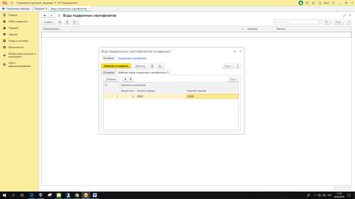После произведенных настроек, открывается раздел «CRM и маркетинг» – «Виды подарочных сертификатов» и «Создать», там вводится наименование и номинал, так же тип карты и статья движения. Помимо этого указывается период действия и как он может быть использован. На закладке «Шаблоны кода подарочных сертификатов» указывается код номер подарочной карты, длина кода и границы. После записи вида подарочного сертификата необходимо перейти в «Подарочные сертификаты» и создать сертификат, где указать только что созданный вид, наименование и штрихкод, а номинал проставляется автоматически.