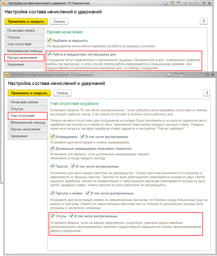 Для того чтобы этот документ был нам доступен в разделе «Настройка» – «Расчет зарплаты» перейдем по ссылке «Настройка состава начислений и удержаний» и на вкладке «Прочие начисления» установим флажок «Работа в праздничные или выходные дни».