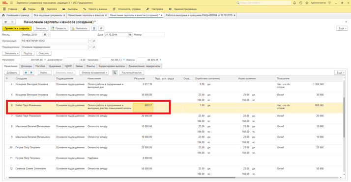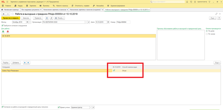 Начисление оплаты за работу в выходной и праздничный день производится автоматически в документе «Начисление зарплаты и взносов».