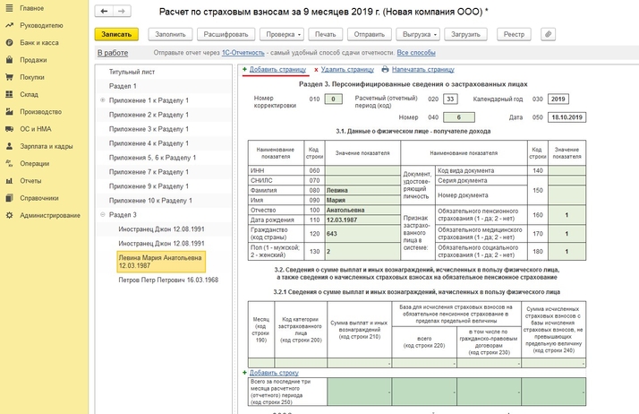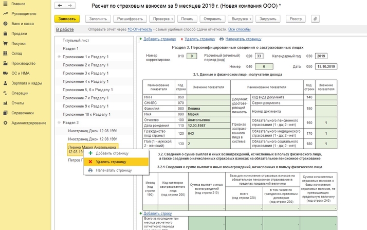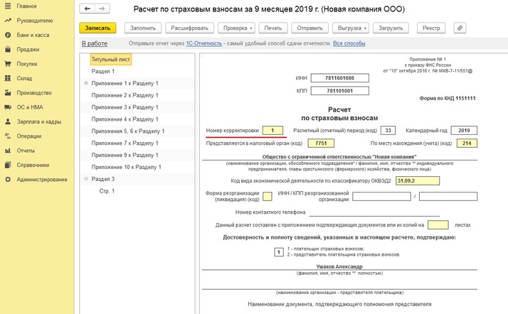 Чтобы выгрузить корректировочный отчет «Расчет по страховым взносам», необходимо создать новый отчет (Отчеты - Регламентированные отчеты – создать Расчет по страховым взносам). В титульном листе указываете номер корректировки, по кнопке «Заполнить» отчет заполняется автоматически. Далее переходите в раздел 3, по кнопке «Добавить страницу» добавляете одну пустую страницу, а все те, что были заполнены, удаляете (правая кнопка мыши – Удалить страницу). После этого нажимаете кнопку «Выгрузить» и выбираете, каким способом будет произведена выгрузка.