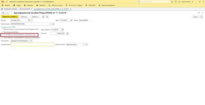 Отметим, что пособие на погребение выплачивается стороннему лицу (не сотруднику организации), и его выплата регистрируется в бухгалтерской программе.
