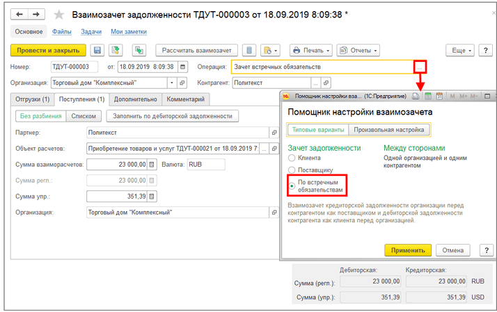 Рассмотрим данную операцию по следующему примеру. Предприятие получило от фирмы «Политекст» товар «Холодильники». Фирма «Политекст» в оплату данного товара согласилась принять от торгового предприятия имеющийся у нее товар «Вентиляторы». Для оформления данной операции в программе зарегистрируем фирму «Политекст» как партнера, с установкой флажков Поставщик и Клиент. Для этого партнера указываем одно юридическое лицо – контрагента, от имени которого будут оформляться документы. Кроме этого определим по каким условиям ей требуется отгружать товар. Поскольку мы будем отгружать товар без предоплаты, то при оформлении документов будем использовать соглашение с условиями отгрузки товаров в кредит. Поступление от фирмы «Политекст» товара «Холодильники» оформляем с помощью документа «Приобретение товаров и услуг». Далее отгрузку товара «Вентиляторы» в фирму «Политекст» следует оформить с помощью документа «Реализация товаров и услуг» с указанием соглашения с клиентом. Отгрузку следует оформлять по кредитному соглашению, в документе «Реализация товаров и услуг» устанавливаем статус «Реализовано». Затем создаем документ «Взаимозачет задолженности» (раздел Казначейство), в котором выбираем операцию «Зачет встречных обязательств», а в качестве контрагента указываем «Политекст». Суммы дебиторской и кредиторской задолженностей можно заполнить автоматически при нажатии кнопки «Рассчитать взаимозачет».