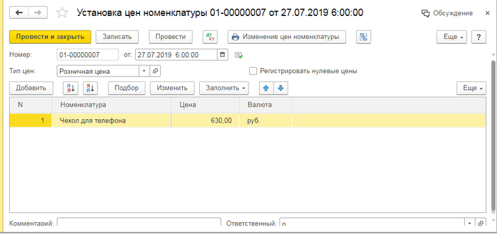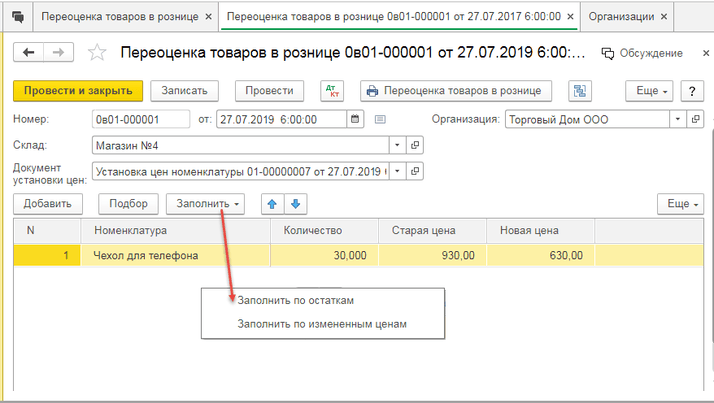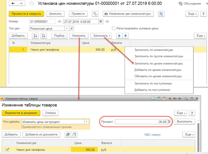 Для установки конкретной цены элементу номенклатуры с привязкой к определенному типу цен используется документ «Установка цен номенклатуры». Заходим в раздел «Склад» -«Цены» - «Установка цен номенклатуры». В поле «Тип цен» укажите «Розничная», который задается для номенклатуры, указанной в табличной части. Кнопка «Заполнить» - «Заполнить по ценам номенклатуры», табличная часть будет заполнена элементами номенклатуры, которым присвоен тип цен «Розничная». Оставьте в табличной части только те товары, по которым предоставляется скидка. Далее необходимо выполнить обработку для группового изменения цен. Кнопка «Изменить». В форме «Изменение таблицы товаров» выберите «Изменить цены на процент» и укажите скидку в размере, например 30%. Далее кнопка «Выполнить». Цены изменятся автоматически по каждому виду номенклатуры, указанной в табличной части. Далее переносим данные по кнопке «Перенести в документ». Затем создаем документ «Переоценка товаров в рознице». По кнопке «Заполнить» - «Заполнить по остаткам» табличная часть будет заполнена остатками товаров на указанном складе с учетом действующих цен и переоценки.