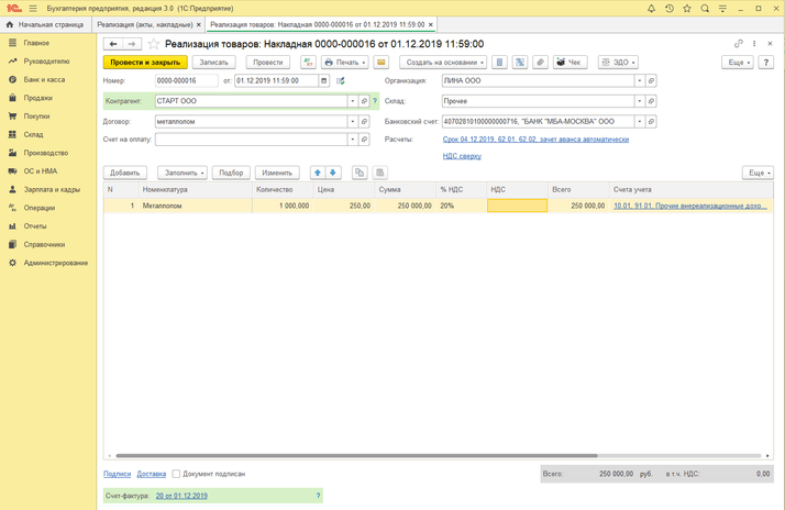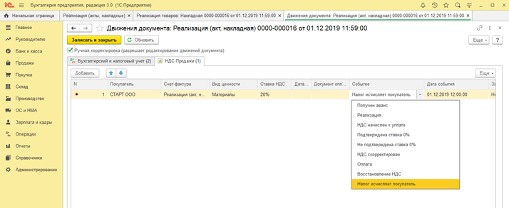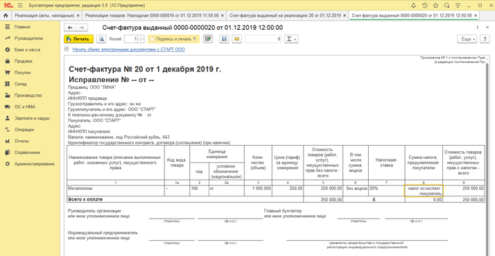 Чтобы выставить счет-фактуру при реализации металлолома в документе "Реализация", нужно указать действующую ставку НДС и удалить сумму налога. В движении документа поставить галку "Ручная корректировка" и в регистре накопления «НДС Продажи» поставить "Событие: Налог исчисляет покупатель". Печатную форму счета-фактуры необходимо будет отредактировать вручную через команду "Редактирование печатной формы" (зеленый карандаш сверху), указав, что налог исчисляет покупатель.