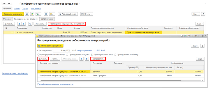 В документе «Приобретение услуг и прочих активов» будет автоматически распределена сумма поставки и будут указаны те документы поставки, по которым распределена сумма.
