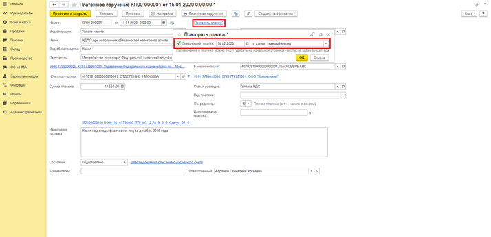 Для этого в документе «Платежное поручение» на перечисление соответствующей оплаты перейдите по ссылке «Повторять платеж?». Откроется форма «Повторять платеж», в которой: