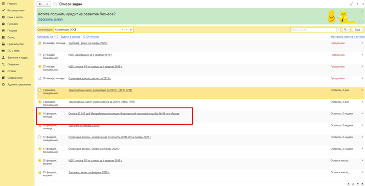 Для платежей с определенной периодичностью можно установить напоминание в списке задач на начальной странице для последующего быстрого создания платежных поручений.