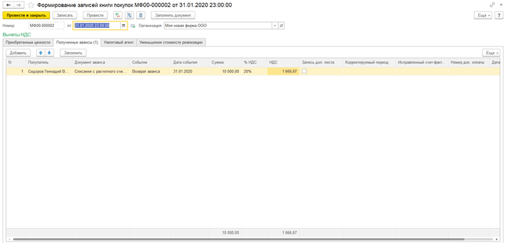 Для отражения данного возврата в книге покупок, необходимо перейти в раздел «Операции» - «Регламентные операции НДС» - «Создать» - «Формирование записей книги покупок». Отразится возврат на вкладке «Полученные авансы».