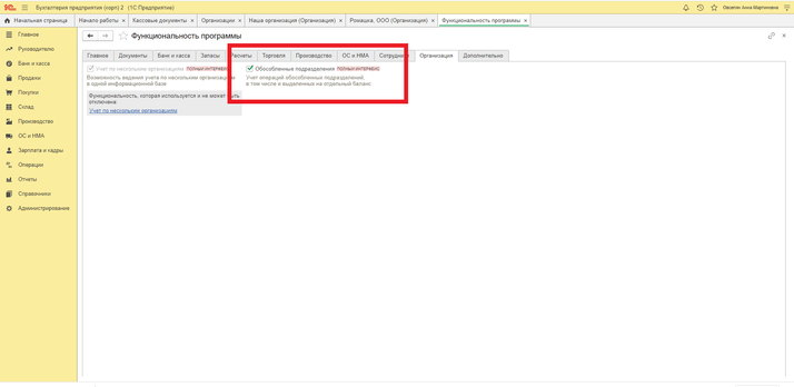 Включить возможность создания обособленных подразделений в типовой конфигурации 1С:Бухгалтерия предприятия КОРП ред.3.0 нужно в окне настройки функциональности на закладке «Организация» поставить флаг «Обособленные подразделения».