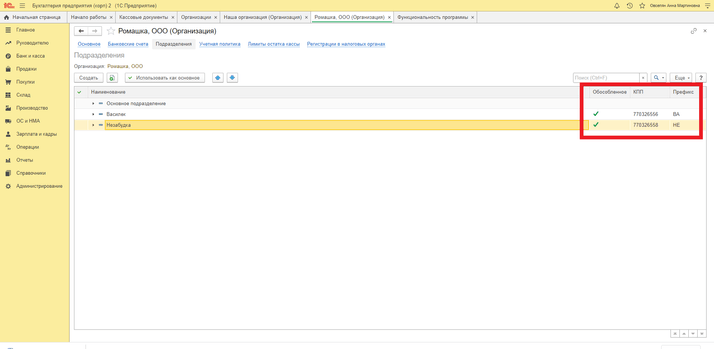 Далее в разделе «Главное» – «Организации» – «Подразделения» создаем подразделение и указываем префикс.