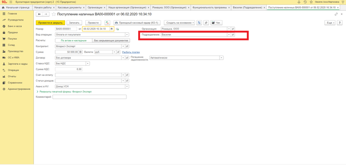 При создание «Приходного кассового ордера» в раздел «Банк и касса» – «Кассовые документы» указать подразделение.