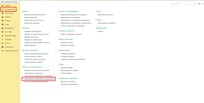 Для того, чтобы отследить просроченную дебиторскую задолженность, срок которой составляет 3 года в программе, необходимо воспользоваться отчетом «Задолженность покупателей по срокам долга». Для того, чтобы его сформировать перейдите в раздел «Руководителю» – «Расчеты с покупателями» – «Задолженность покупателей по срокам долга».