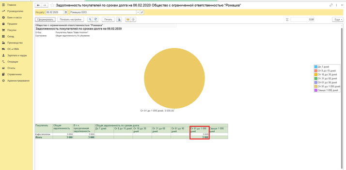 Сумма просроченной дебиторской задолженности, срок которой составляет 3 года по контрагенту, отразится в колонке от 901 дня до 1095 дней.
