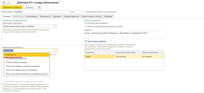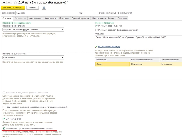 Включить надбавку в расчет аванса за первую половину месяца можно перейдя в карточку начисления (раздел «Настройки» - «Начисления» - открываете нужное Вам начисление). На закладке «Основное» должно стоять «Назначение начисления» - «Ежемесячно» (рис.1), тогда станет доступна галочка «Начисляется при расчете первой половины месяца» (рис.2). Далее записываете и закрываете начисление.
