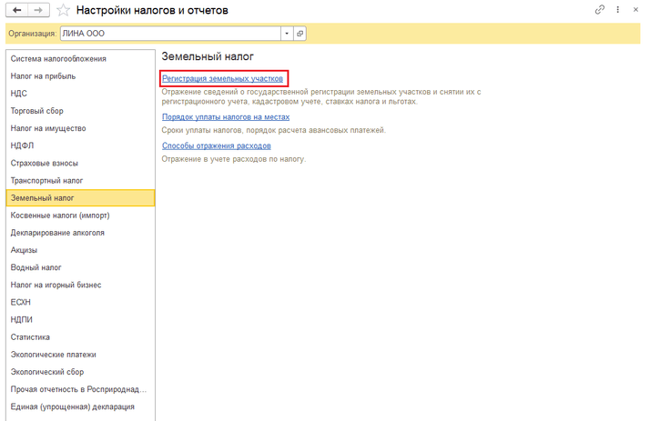Чтобы земельный налог перестал начисляться в программе, необходимо снять с учета объект. Для этого необходимо зайти через раздел «Главное» - Налоги и отчеты. Из списка выбираем «Земельный налог» и переходим по ссылке «Регистрация земельных участков», в которой через кнопку «Создать» выбираем «Снятие с учета». В открытом документе указываем земельный участок и дату снятия с учета.