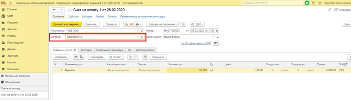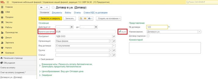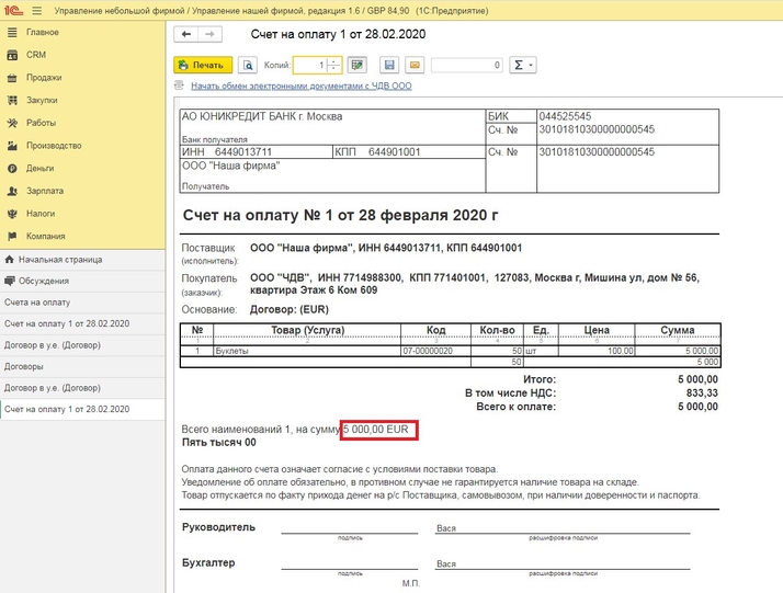 В документе " Счет на оплату " (раздел «Продажи» – «Счета на отплату») необходимо выбираем договор с признаком расчетов в условных единицах. Тогда в печатной форме документа "Счет на оплату" будет указана валюта, прописанная в договоре.