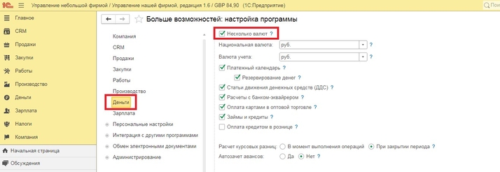 Для отражения в печатной форме документа «Счет на оплату» суммы в валюте, необходимо установить настройку, что в программе ведется учет по различным валютам. Для включения данной настройки необходимо отметить пункт в настройках: раздел «Главное» - «Еще больше возможностей» — «Деньги» — «Несколько валют». Тогда при создании договора появятся поля: «Валюта расчетов» и «в у.е.». В поле «Валюта расчетов» отражаем нужную валюту, а в поле «в у.е.» ставим галку.