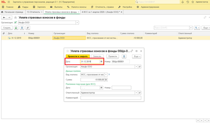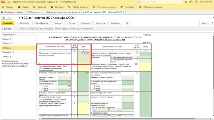 Скорректировать задолженность в отчете 4-ФСС по строке 1 таблицы 2 можно с помощью документа «Уплата страховых взносов».
