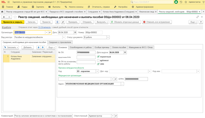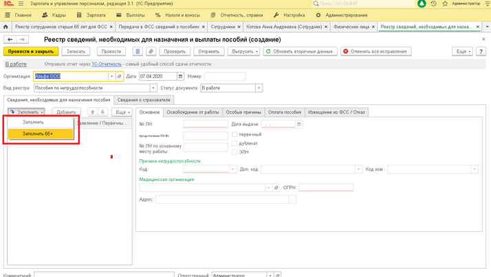 Для формирования реестра необходимо в разделе «Отчетность, справки» - 1С-Отчетность -«Создать» - «Реестр сведений, необходимых для назначения и выплаты пособий». После установки расширения в нем становится доступна команда «Заполнить 65+». По ней реестр заполняется сотрудниками, родившимися 06.04.1955 и ранее, в соответствии с требованиями ФСС.
