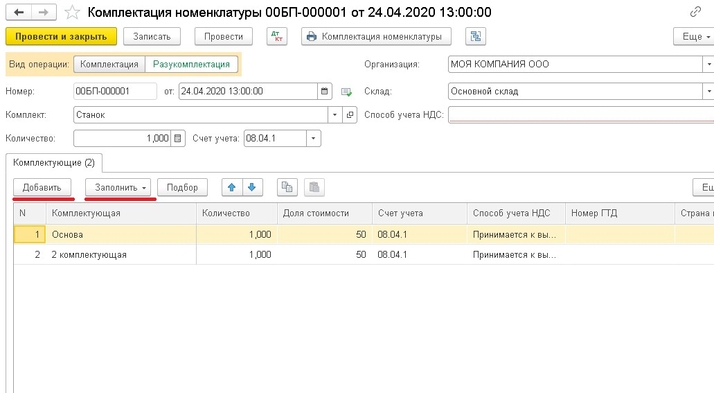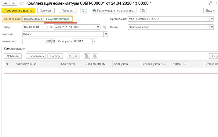 чтобы провести операцию разукомплектации изделия, необходимо ввести документ «Комплектация номенклатуры» (раздел «Склад» - «Комплектация номенклатуры»), там переключаете на вкладку «Разукомплектация» . В документе указываете комплект и склад, на котором он находится. Ниже в табличной части, по кнопке «Заполнить» или «Добавить» прописываете комплектующие. Деление стоимости на комплекты в данном документе происходит по долям стоимости. После проведения, в проводках можно проверить суммы, на которые произошло разделение и подкорректировать вручную если за счет округления, что то рассчиталось неверно.