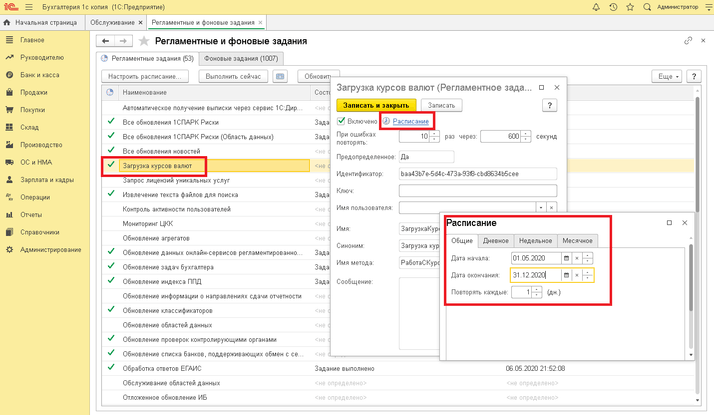 В появившемся списке выбрать «Загрузка курсов валют» - установить флажок «Включено» и перейти по ссылке «Расписание» - установить дату начала и окончания для выполнения задания. Например, с текущей даты и до конца года, т.е. теперь каждый день при открытии программы будут автоматически загружаться курсы валют.