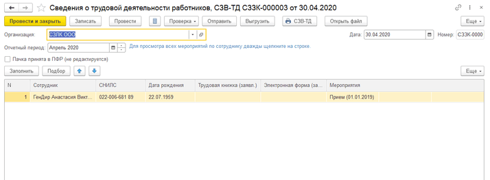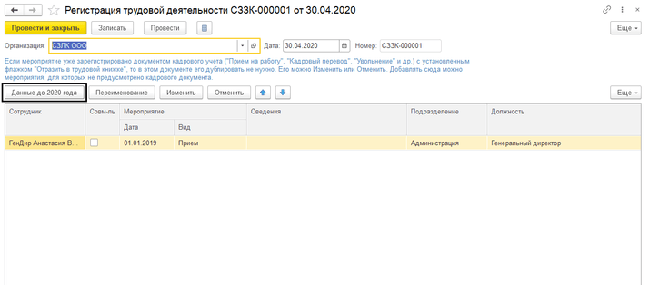 Если ПФР прислал уведомление о предоставлении данных о сотрудниках до 2020 года, необходимо создать документ «Регистрация трудовой деятельности». Данный документ находится в разделе «Кадры» - «Электронные трудовые книжки». По кнопке «Создать» выбирается «Регистрация трудовой деятельности» (рис.1). В документе необходимо нажать на кнопку «Данные до 2020 года», тогда табличная часть будет заполнена мероприятиями до 2020 года, кадровые документы по которым заведены в программе (рис.2). Затем создается новый отчет СЗВ-ТД и по кнопке «Заполнить» или «Подбор» подтягиваются данные из созданного документа «Регистрация трудовой деятельности» (рис.3).