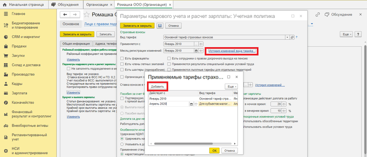 В открывшемся окне, в блоке «Страховые взносы», через Историю изменения по кнопке «Добавить» установите месяц с которого будет применятся новый тариф и вид тарифа – «Для субъектов малого и среднего предпринимательства». Записать и закрыть.
