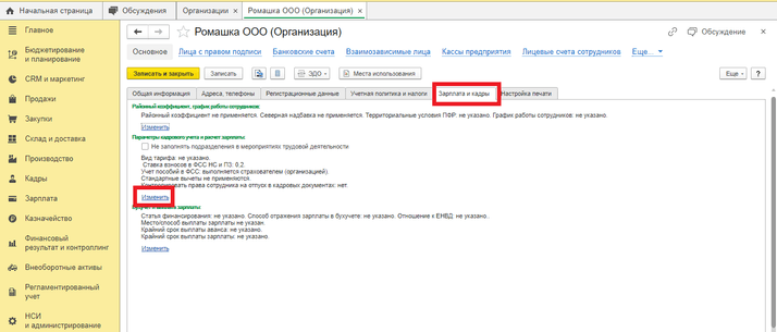 Для того чтобы изменить вид тарифа в программе 1С:Комплексная автоматизация ред. 2.4, необходимо перейти в раздел «НСИ и администрирование», в подразделе «НСИ» нажмите на «Реквизиты организации». В открывшемся окне перейдите на закладку «Зарплата и кадры», выберите «Параметры кадрового учета и расчета зарплаты» – «Изменить».