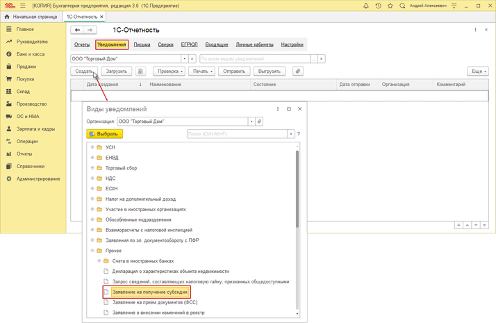 В разделе «Отчеты» - «Регламентированные отчеты» - на верхней панели перейти по ссылке «Уведомления» - открыть «Виды уведомлений» - Создать – «Заявление на получение субсидии».