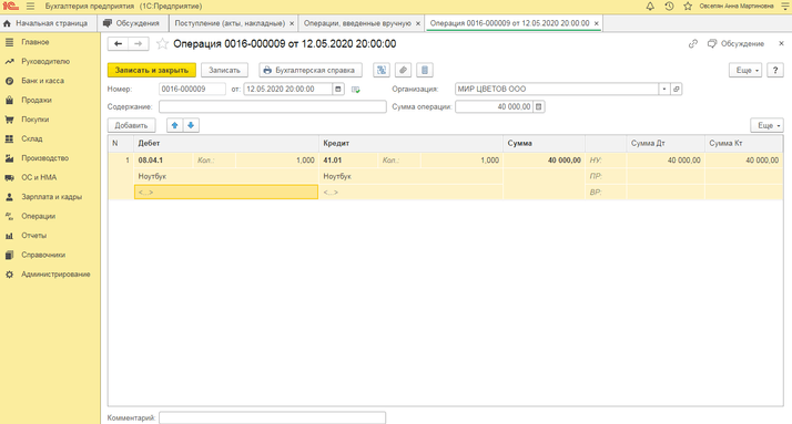 Раздел «Операции» – «Операции, введенные вручную» - Создать - вид документа «Операция», Дебет – 08.04.1 «Приобретение компонентов основных средств» и Кредит – 41.01 «Товары на складах» с указанием соответствующих субконто. Кнопка «Записать и закрыть».