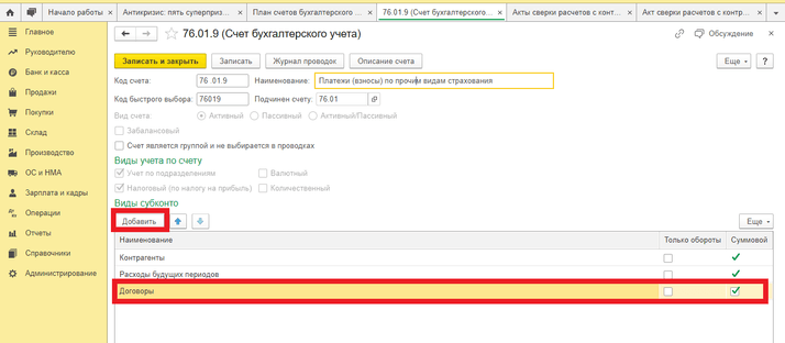 Счет 76.01.9 имеет субконто Контрагенты, но не имеет субконто Договоры. Для того чтобы добавить данное субконто необходимо перейти в раздел Главное – План счетов – 76.01.9 «Платежи (взносы) по прочим видам страхования», в открывшейся карточке счета в таблице Виды субконто – Добавить – Договоры – Записать и закрыть.
