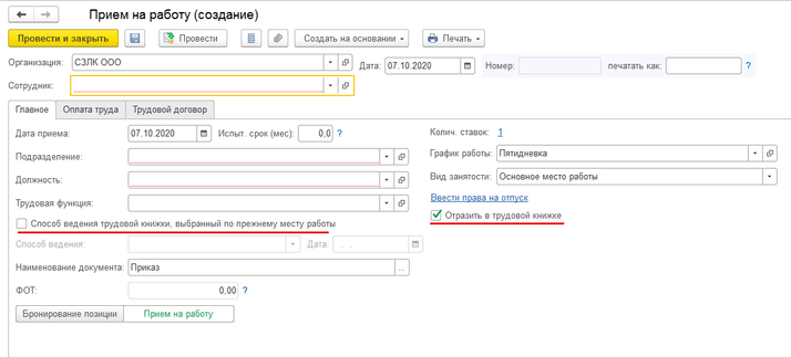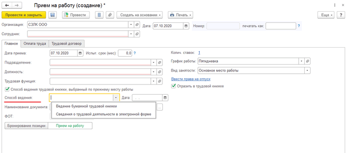 В документе «Прием на работу» появилась возможность указать способ ведения трудовой книжки, если по сотруднику уже было подано заявление о ведении в ПФР. Чтобы данная графа стала активной, необходимо установить флажок «Отразить в трудовой книжке» и затем поставить флажок «Способ ведения трудовой книжки, выбранный по прежнему месту работы» . После этого будет доступно поле «Способ ведения» для выбора «Ведение бумажной трудовой книжки» или «Сведения о трудовой деятельности в электронной форме», а также доступна графа даты формирования заявления в ПФР по прежнему месту работы.