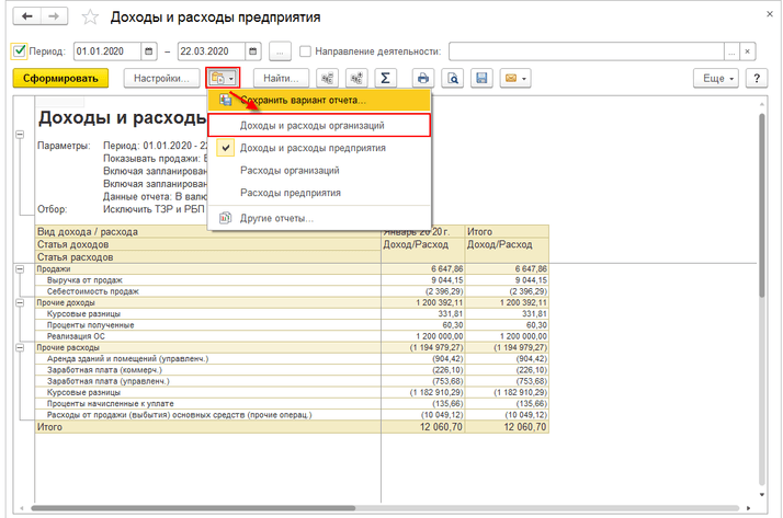 Выбрать вариант формирования отчета можно непосредственно в форме самого отчета по кнопке «Выбрать другой вариант отчета или сохранить новый» или в списке отчетов по финансовому результату. По умолчанию вариант отчета «Доходы и расходы организаций» в списке отчетов по финансовому результату отсутствует и чтобы добавить отчет в список, установите соответствующий флажок по кнопке «Настройка» в разделе «Финансовый результат и контроллинг» – «Отчеты по финансовому результату».