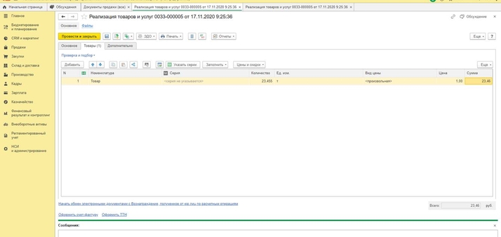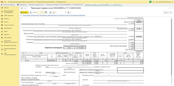 Раздел «Продажи» - «Документы продажи (все)» - «Реализация товаров и услуг» - на закладке «Товары» - переходим в справочник номенклатуры – по кнопке «Еще» - «Разрешить редактирование реквизитов» - «Разрешить редактирование» - «Единицы измерения и условия хранения» - Индивидуальный набор – Список – Создать – указать вес (брутто) т – Записать и закрыть. При данной настройке в печатной форме ТОРГ-12 будет заполнено поле «Масса брутто» и прописью на печать будет выводиться вес.