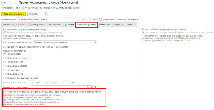 Как в среднем заработке учитывать премию оплачиваемую за период в который входят Нерабочие оплачиваемые дни в программе 1С:Зарплата и управление персоналом ред.3.1?