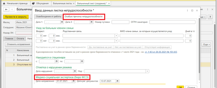 Далее необходимо создать и заполнить документ «Сведения для реестра прямых выплат ФСС». После заполнить и отправить в ФСС «Реестр прямых выплат ФСС», в котором на закладке «Особые причины» заполнится раздел «Медико-социальная экспертиза (бюро МСЭ)».