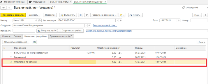 На закладке «Начислено (подробно)» период назначения пособия будет оплачен как больничный, а период прохождения МСЭ будет зарегистрирован как «Отсутствие по болезни» сумма которого будет равна нулю.