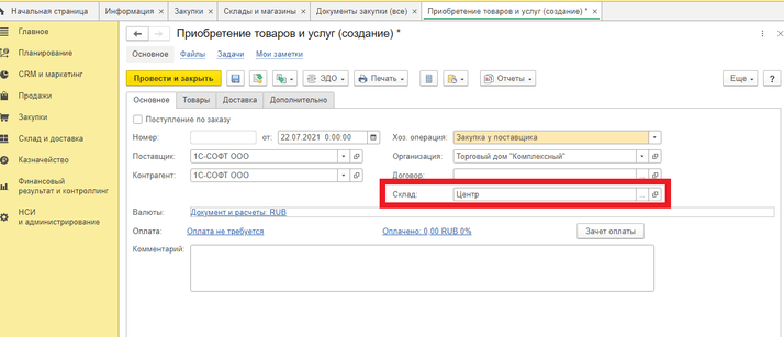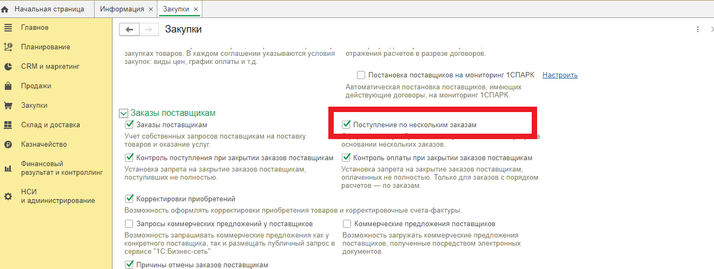Перейти в раздел « НСИ и Администрирование» подраздел «Настройка НСИ и разделов» пункт «Закупки» - «Документы закупок», проставить галочку «Поступление товаров на несколько складов»