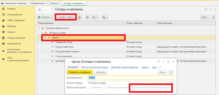 После в разделе «НСИ и Администрирование» в подразделе «НСИ» в справочнике «Склады и магазины» создать группу складов , внутри которой будут 2 склада.