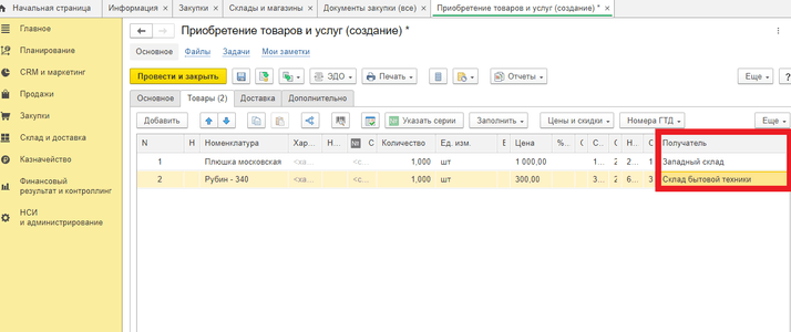 После соответствующих настроек в документе поступления во вкладке «Основное»в поле«Склад» выбираем данную группу. Во вкладке «Товары» указываем товар и получателя (определенный склад). Так по одной накладной можно сделать поступление по нескольким складам.